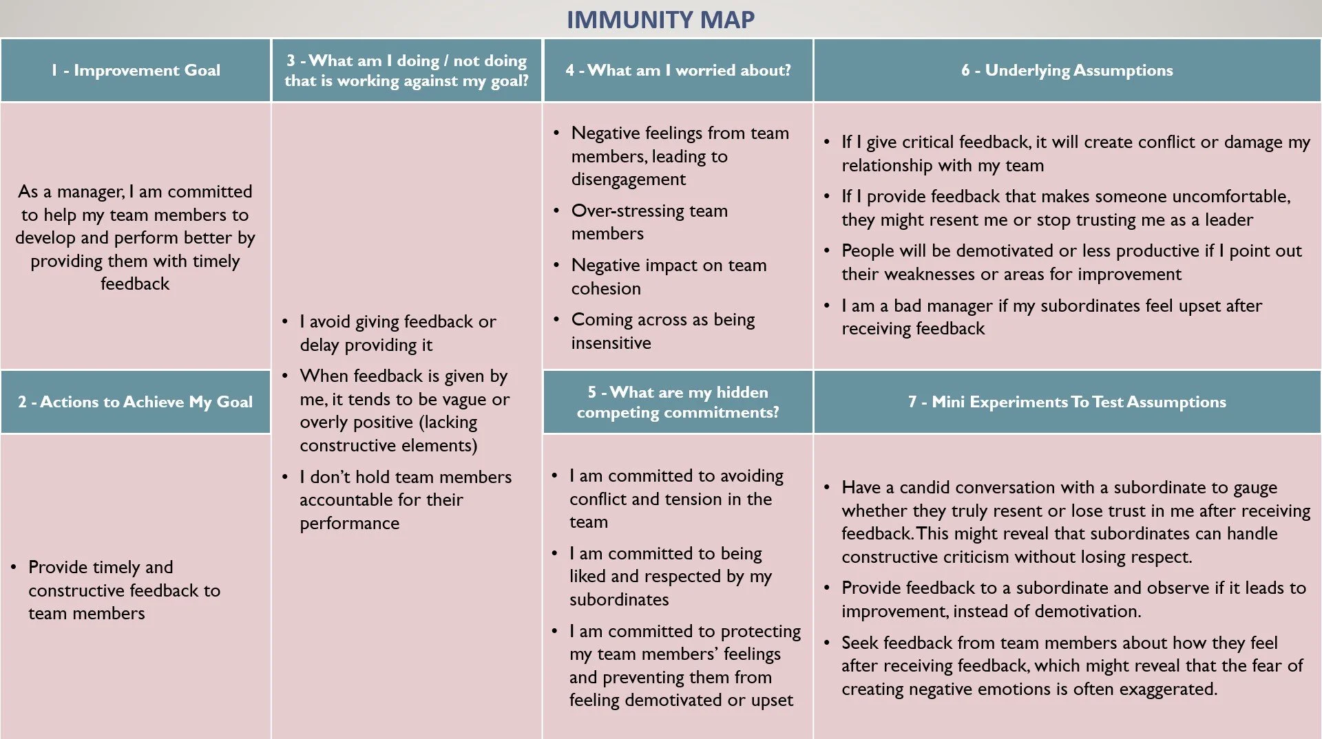 The Immunity Map is a handy tool to help individuals and organizations surfaced “hidden” (i.e. unconscious) competing commitments. By identifying these hidden competing commitments, individuals and organizations can then take steps (e.g. via mini experiments to challenge underlying assumptions) to address them.